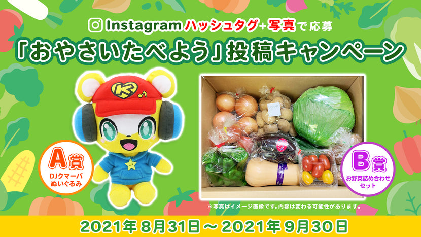 JA全農とのコラボ企画として、豪華プレゼントが当たるキャンペーンを開催します。 期間中にハッシュタグ「#おやさいたいそう」「#クマーバ」 をつけて野菜を食べているお子様の写真をご投稿ください。 投稿してくださった中から抽選で20名様に豪華賞品をプレゼントします。 たくさんのご応募をお待ちしております!<応募方法> 豪華商品はこちら! A賞:DJクマーバぬいぐるみ(10名様) ちょっと大きめでかわいいDJクマーバのぬいぐるみです。(サイズはH22.0×W17.5×D12.0) B賞:お野菜詰め合わせセット(10名様・JAグループ提供)JAファーマーズマーケットからお届けする「お野菜詰め合わせセット」となります。 ※写真はイメージ画像です。内容は変わる可能性があります。 【キャンペーン概要】◆応募条件 ●投稿は保護者の方の許可のもと、ご自身のお子さまのお写真のみとさせていただきます。◆応募期限:2021年8月31日(火)〜2021年9月30日(木)◆応募方法:Instagramでハッシュタグ「#おやさいたいそう」「#クマーバ」をつけて「お子さまが野菜を食べている写真」を投稿で応募完了です。◆結果発表:厳正な抽選の上、当選者のみにインスタグラムのダイレクトメールにてご連絡いたします。インスタグラムからメッセージが受信できるように設定していただき、クマーバチャンネル公式アカウント(@kumarba_channel)からのメッセージを受けるようにお願いいたします。 【キャンペーン注意事項】●アカウントを非公開している場合、キャンペーンの対象にはなりませんので、ご注意ください。●投稿データには、個人を特定できる可能性のある情報の記載、映り込みがないようにしてください。●投稿データに投稿者、投稿者のお子さま以外の方が映っている場合、必ず投稿前にその方(お子さまの場合は保護者)から許諾を得てください。またモデル事務所など所属の場合は、所属事務所からの許可を得た上で投稿してください。●投稿データに第三者の知的財産権が含まれる場合、必ず投稿前に権利者からの許諾を得てください。●当社は投稿データを、当社の出版物、販促物への掲載など、紙、webページ等媒体を問わず、当社の事業の範囲内で自由に利用できるものとします。また、利用にあたり、投稿データを必要な範囲内において、修正、改変、要約、翻訳、翻案することがあり、あらかじめ投稿者はこれを承諾します。●投稿データに関する著作権は、投稿者に権利が留保されるものとしますが、投稿データを基にして、当社の発意に基づいて創作された著作物にかかる著作権は当社に帰属するものとします。●プレゼントの権利を譲渡・換金・変更することはできません。●本キャンペーンにご応募(インスタグラムに投稿)いただいた時点で本規約に同意したものとみなします。●キャンペーンに対するご質問やお問い合わせ、応募受付の確認などについてのご質問にはお答えできません。あらかじめご了承ください。●本キャンペーンへの応募に関し、応募者と第三者との間に紛争が生じた場合、応募者は自らの責任と費用負担によりその紛争を解決し、弊社に一切損害を与えないものとします。●お問い合わせに関する返信はすべて日本語で対応しております。あらかじめご了承ください。●キャンペーンは、予告なく終了する場合があります。●当サイトでのサービスの一部またはすべてを事前に告知することなく、変更・中断あるいは中止または終了する場合があります。●本規約は一部またはすべてを事前に告知することなく、変更をする場合があります。●個人情報の取り扱いおよびプライバシーポリシーは下部に記載しております【応募について】●応募条件や注意事項をご確認のうえ、投稿ください。●運営事務局側で、キャンペーン概要や注意事項に反した投稿と見なした場合、応募や当選を無効にする場合があります。●期日までにご連絡がない場合、無効とさせていただく場合がございますのであらかじめご了承ください。●プレゼントは、当選者への連絡後一ヶ月以内に順次発送いたします。●郵便事故などによる再発送等は原則いたしませんので、あらかじめご了承ください【免責事項】●ネットワークの不具合、コンピューターウィルスの影響およびサーバーへの不正アクセスなどに関連して生じた応募者の損害などについて、弊社は一切の責任を負わないものとします。 【お問い合わせ先】クマーバチャンネル運営事務局E-mail:kuma-ba@aktsk.jp※お問い合わせについてはEメールのみとなります。予めご了承ください。※お問い合わせは順次ご返信させていただきますので、お時間をいただく場合がございます。あらかじめご了承ください。<個人情報の取り扱い>お客様に入力頂いた個人情報は、プレゼント発送を利用目的とし、弊社以外の第三者に開示・提供することはありません。 その他お客様の個人情報取り扱いについては、プライバシーポリシーを御覧ください。<プライバシーポリシー>https://kumarba.com/policies/p